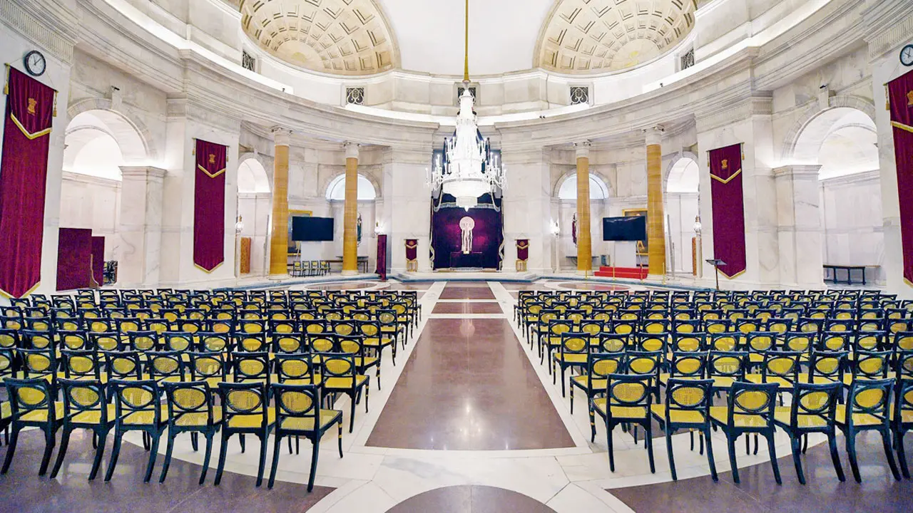 勲章の授章式とかを行う場所。素晴らしい建築様式でした。この官邸はイギリス統治時代の1912年、総督府をカルカッタからデリーに移す際、建てられました。完成は1929年。イギリス人エドウィン・ラッチェンスが設計しました。この人はインド門も設計しました。
