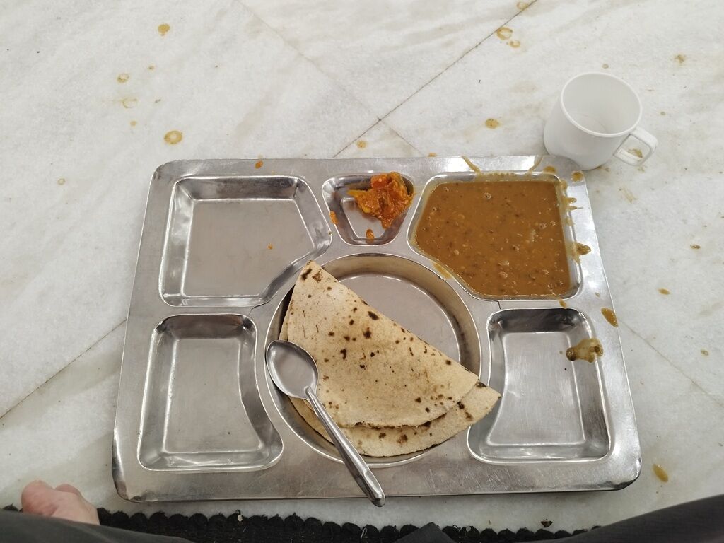 最初にお盆が配られ、次にローティ、アチャール(漬物)、ダール、そして最後にチャイが給仕されました。ローティやチャイをいただくときは片手ではなく、両手で受け取ります。とてもシンプルな料理ですが、十分おいしくいただけました。チャイが美味しかったのでお代わりしました。