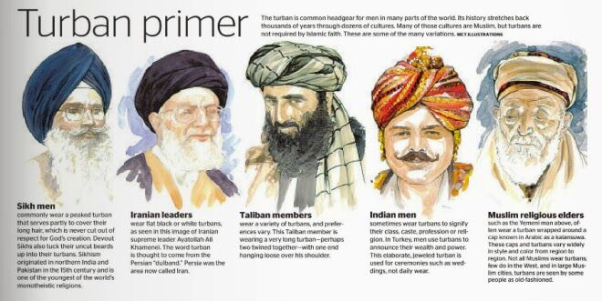 彼らパンジャブ州のスィク教徒は世界中に移民していて、ターバンと言えばインド人みたいになっています。実際、インドではスィク教徒じゃなくてもターバンを巻いている人が結構いますが、下の写真でスィク教徒は一番左。後は巻き方が違っていて、イスラム教徒やヒンドゥー教徒のものです。
