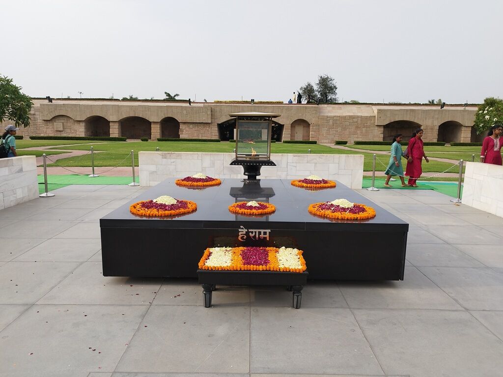 写真はラージ・ガート。ガンディーが荼毘に付された場所で、石碑には最後の言葉「へー・ラーム」(おお神よ)が刻まれています。インドの人たちは、みな時計回りに歩いて写真を撮ったり、祈りを捧げたりしていました。